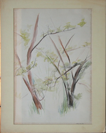 Watercolored pen & ink, 12 x 17-3/8; in 16x20 mat; signed. Mat corner bent. Image discolored near edges.